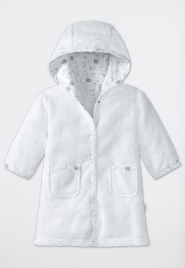 Nach einem aufregenden Bad kuscheln sich kleine Babys am liebsten in einen wunderbar weichen Bademantel – so, wie in dieses weiße Unisex-Modell in etwa! Der fühlt sich in feinem Frottee nämlich einfach herrlich an und bekommt mit den grau-weißen Schäfchen im Kapuzenfutter, an der Knopfleiste, dem Armeinfass und Taschenrand niedliche Details. Ein zuckersüßes Baby-Basic für Mädchen oder Jungen – natürlich in bester SCHIESSER-Qualität!