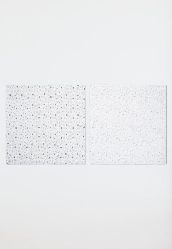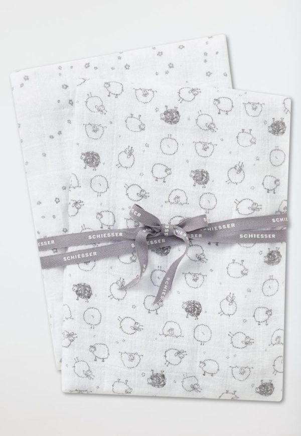 Baby-Basics im Doppelpack: Diese beiden (65x65cm) weiß-grauen Baby-Mulltücher werden in herrlich weichem Material ein ständiger Begleiter Ihres kleinen Lieblings werden! Ganz gleich, ob zum Schmusen, Unterlegen oder als klassisches Spucktuch, mit niedlichen Schäfchen und kleinen Sternen sehen die Mulltücher nicht nur goldig aus, sondern umgarnen Babys Haut zudem herrlich soft mit 100% feinster Baumwolle. Ein zuckersüßes Duo in bewährt bester SCHIESSER-Qualität!