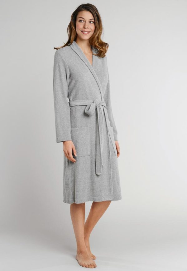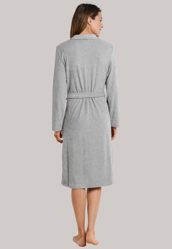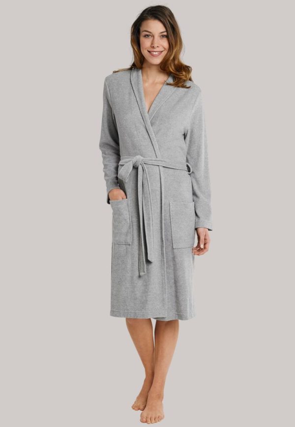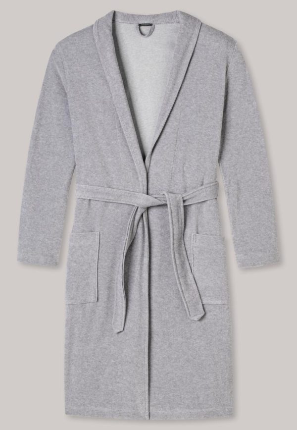Lockerleicht Wohlfühlen: Dieser grau melierte Damenbademantel ist die perfekte Kombination aus feinem Design und gemütlichem Material. Ein dezenter Kragen, Taschen und das innere Bindeband schenken dem Bademantel dabei einen behaglichen Charakter, der sich im leichten Frottee Außen und mit glattem Material im Innenteil herrlich sanft und leicht auf der Haut anfühlt. Genau das Richtige für Damen, die es sich nach einem schönen Bad am liebsten in bester SCHIESSER-Qualität gemütlich machen.