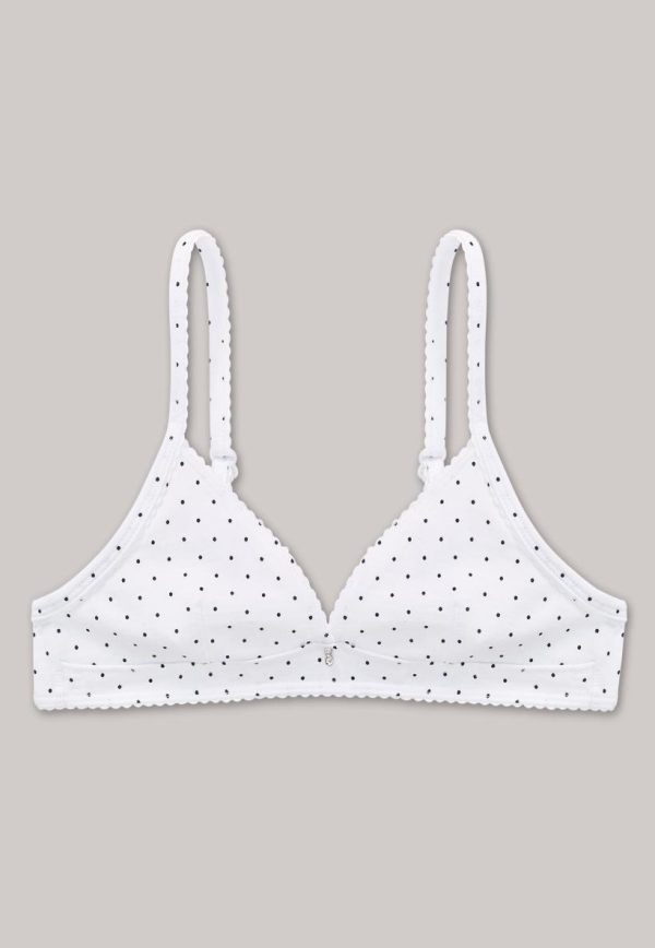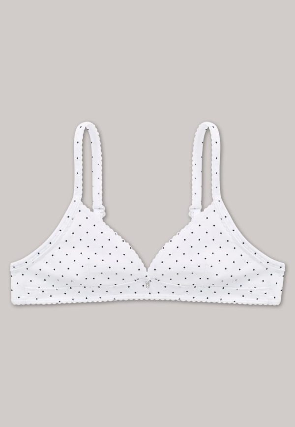 Tagwäsche mit französischer Raffinesse: Dieser weiße Mädchen-BH sieht nicht nur wunderhübsch aus, sondern ist zudem herrlich bequem! Feine, schwarze Pünktchen und der funkelnde Anhänger am Mittelsteg schenken dem BH einen modernen Flair, der in elastischem Single Jersey wunderbar weich auf der Haut spürbar wird. Ein softer, erster Lieblings-BH in bester SCHIESSER-Qualität!