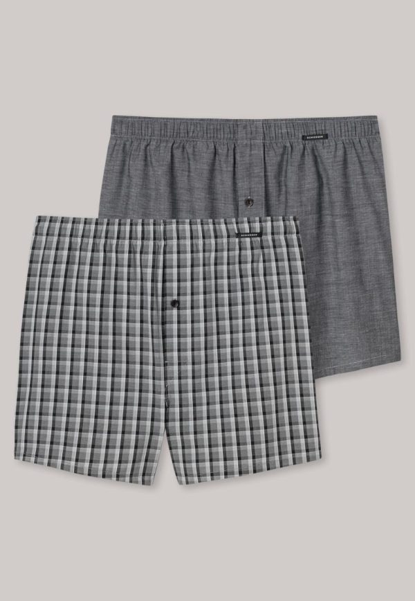 Diese beiden Herren-Boxershorts aus 100% soft gewebter Baumwolle zeichnet neben hohem Tragekomfort auch ein lässiger Look aus. Schwarze, hellgraue und weiße Töne im Karomuster weist das eine Modell auf, das zweite überzeugt in der dezenten, schwarz-weißen Ringel-Variante. Die Knopfleiste mit sichtbarem Knopf setzt ein funktionales Detail, der angenehme Bund sorgt den ganzen Tag über für komfortablen Halt. Ein maskuliner und bequemer Wäsche-Doppelpack in bester SCHIESSER-Qualität!