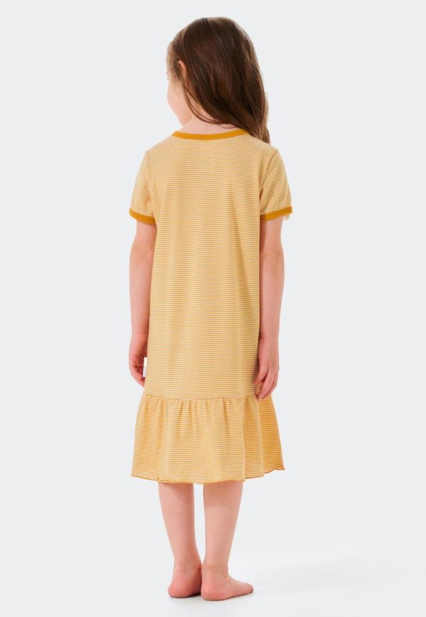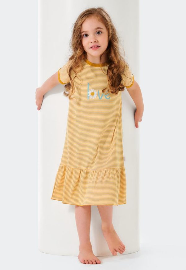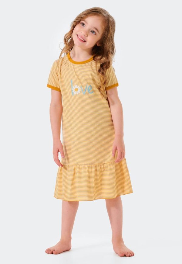 Aufgepasst, ihr kleinen Traumtänzerinnen – dieses hübsche Kurzarm-Nachthemd in strahlend Gelb ist einfach nur zuckersüß! Der fröhliche Ringel-Look und Volant sorgen für jede Menge gute Laune beim Zubettgehen. Auf der Brust wird ein toller „love“Schriftzug samt großer Margariten-Blüte zum echten Hingucker. Das natürliche Material in Baumwoll-Bamboo-Qualität ist besonders atmungsaktiv und garantiert auch in warmen Sommernächten entspannte Träume. Rundum bequem in bester SCHIESSER-Qualität.