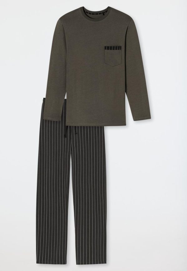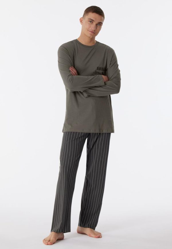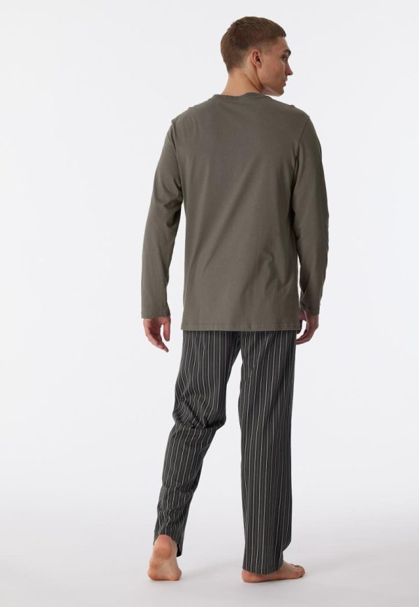 - langer, taupefarbener Herren-Schlafanzug mit gestreifter Hose in Taupe, Anthrazit und Off-white